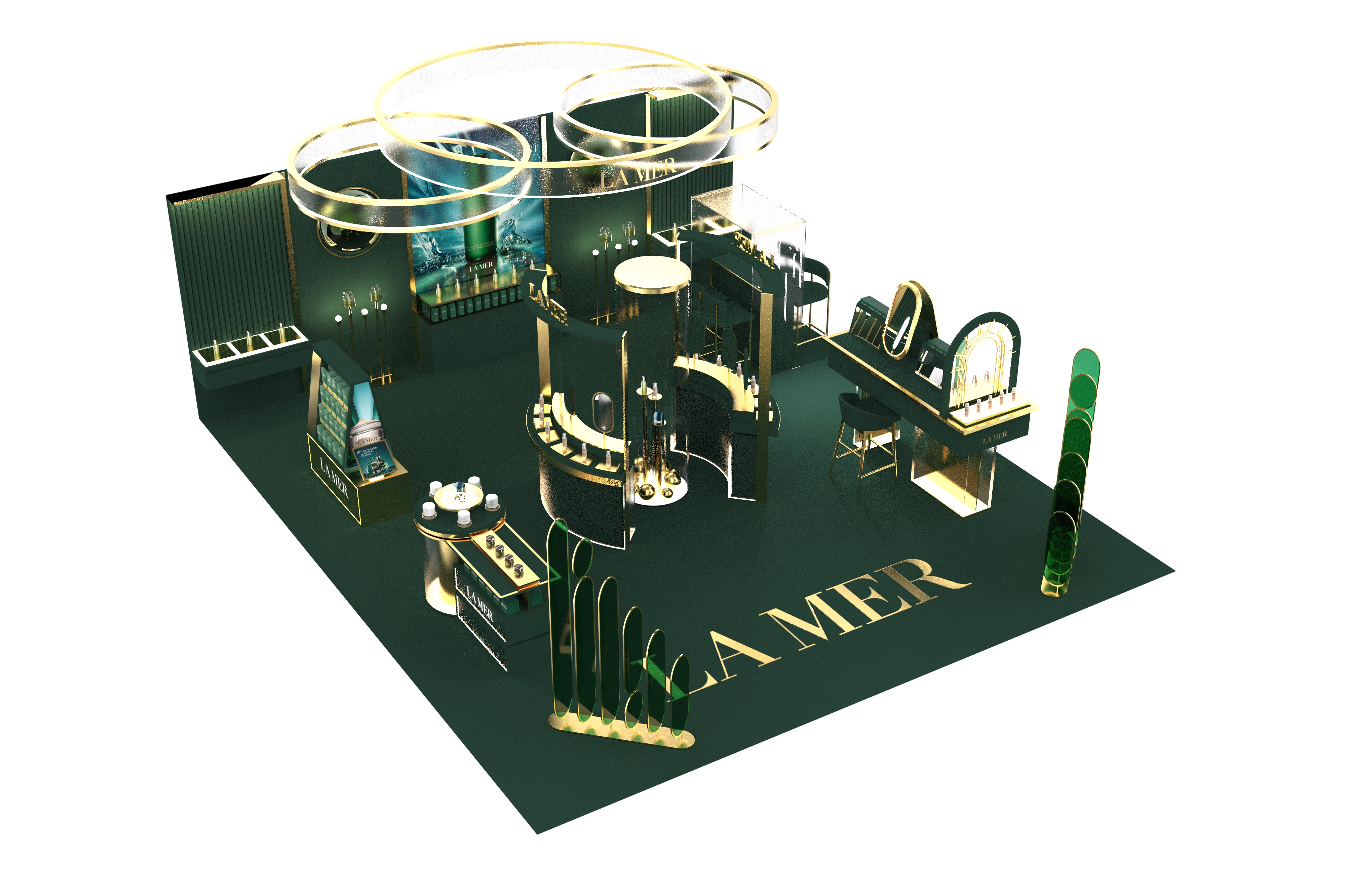 This luxurious pop-up booth blends product showcase and immersive experience, featuring a display counter with elegant branding and curated product arrangements. On the right, a photobooth with dynamic lighting and interactive elements invites guests to capture memorable moments.