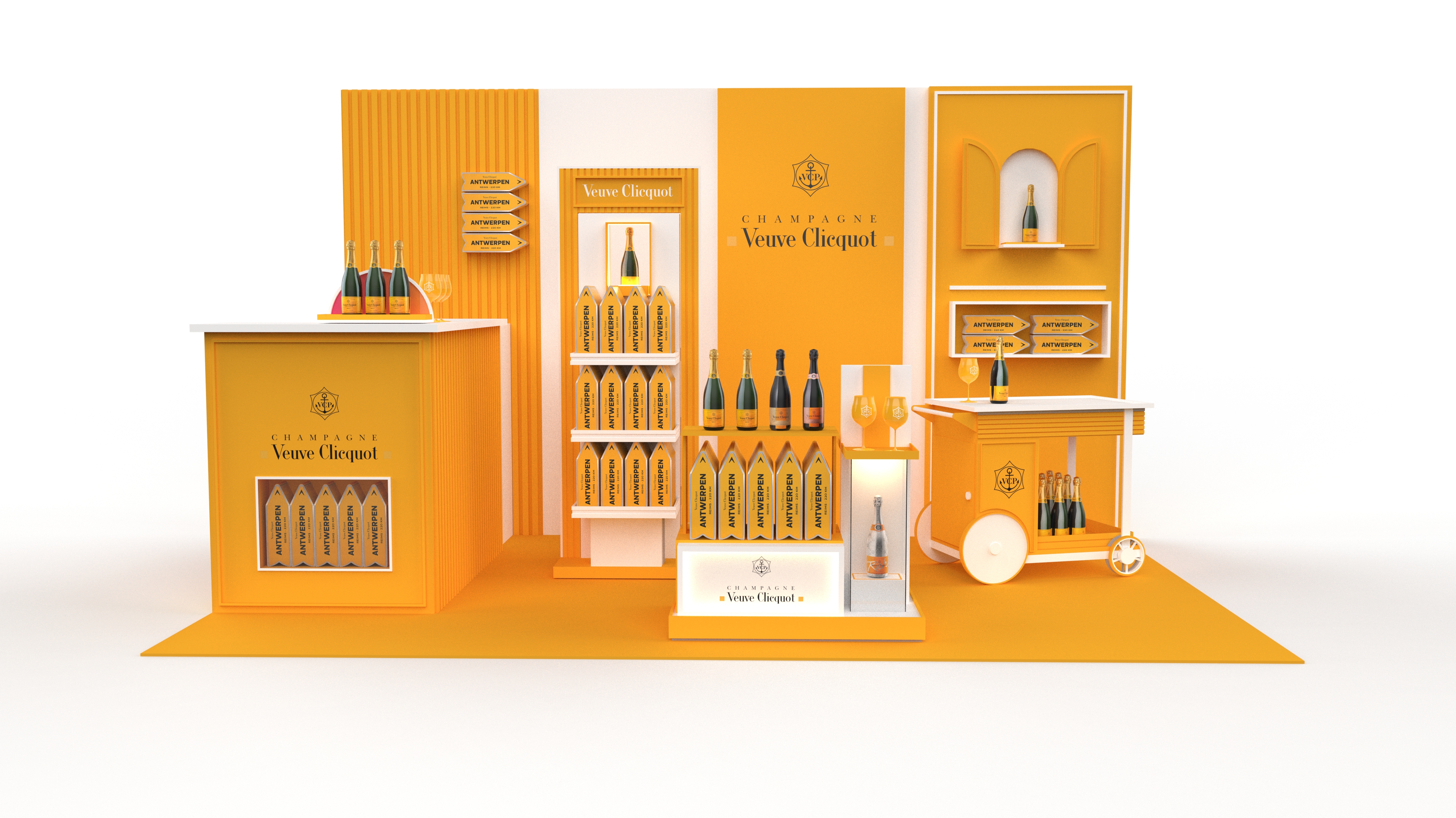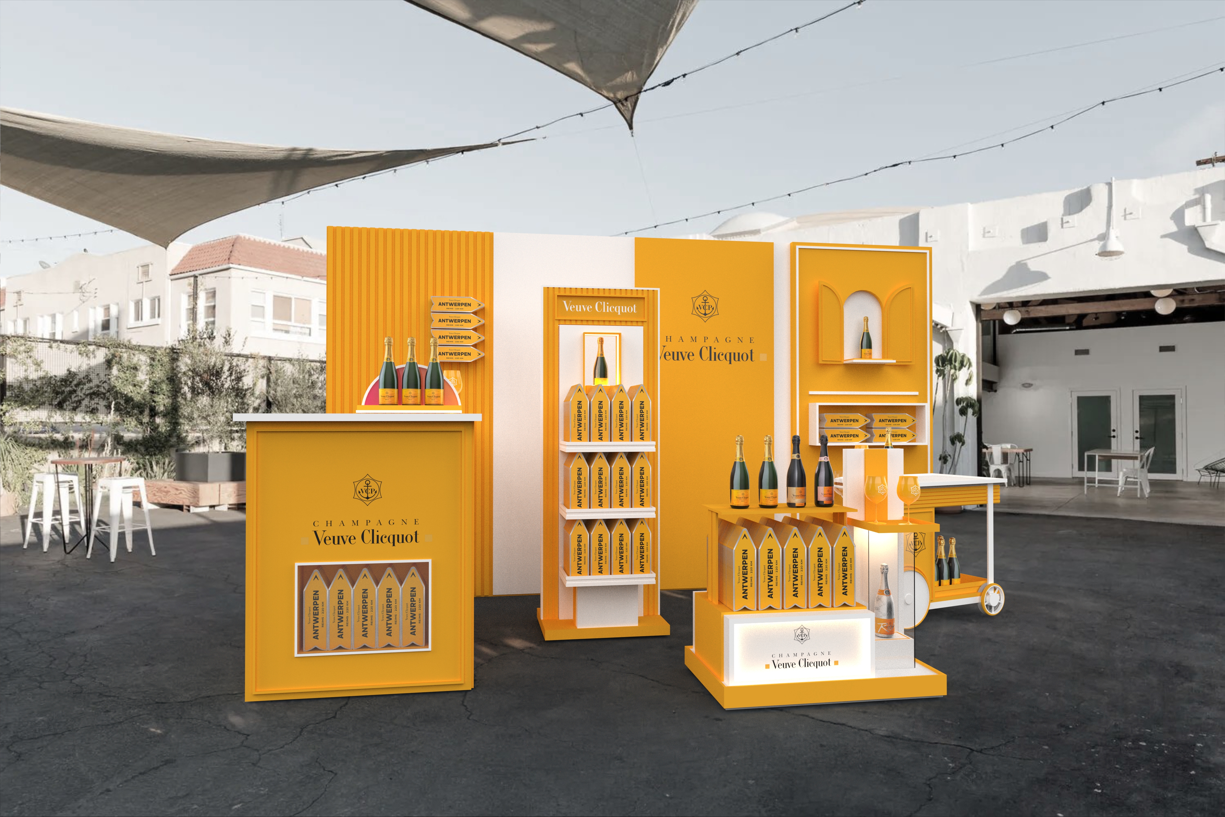The Veuve Clicquot booth is designed for an evening beach setting with a vibrant and social atmosphere. The compact, modular layout allows for easy setup and transport. The space features lightweight walls and POSM displays that frame the area, creating an open and inviting flow. A modular bar and mobile bar cart support flexible serving and event use, while warm lighting and bright brand accents bring the lively Veuve Clicquot spirit to life.